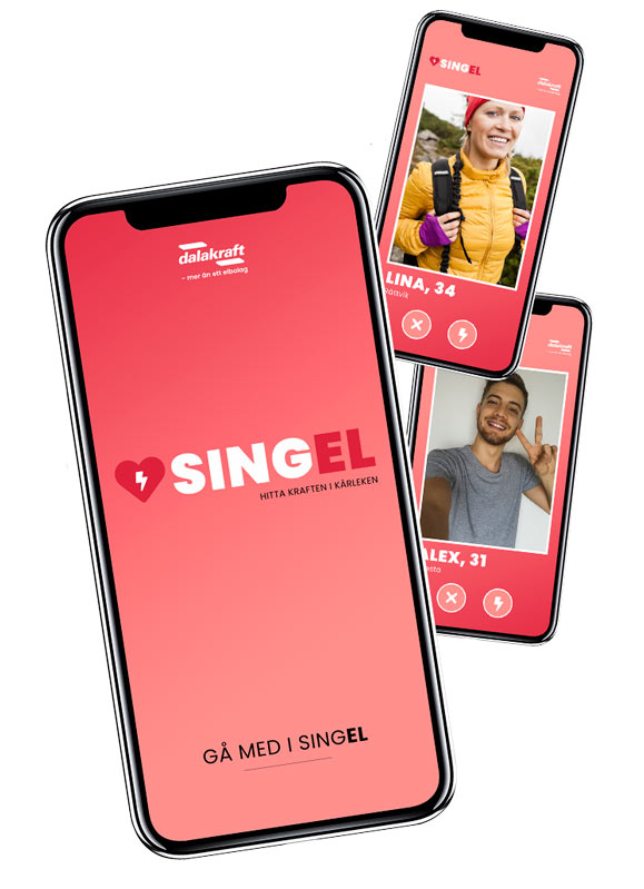 Vi har lagt all vår kraft på att skapa en app för er där gnistor kan uppstå och som kan leda till kärleken. Tillsammans med elavtalet SingEl får du en upplevelse utöver det vanliga. Vi hoppas att du kommer träffa kärleken där. Ett stort plus är att du och din kärlek kommer ha samma elavtal - inga problem att välja rätt när ni flyttar ihop! Ladda ner appen, teckna elavtalet SingEl och du är igång med ditt dejtande. Naturligtvis finns här också kundförmåner så som 10 Kwh gratis el vid en match mm. Se hela listan på förmåner i appen.