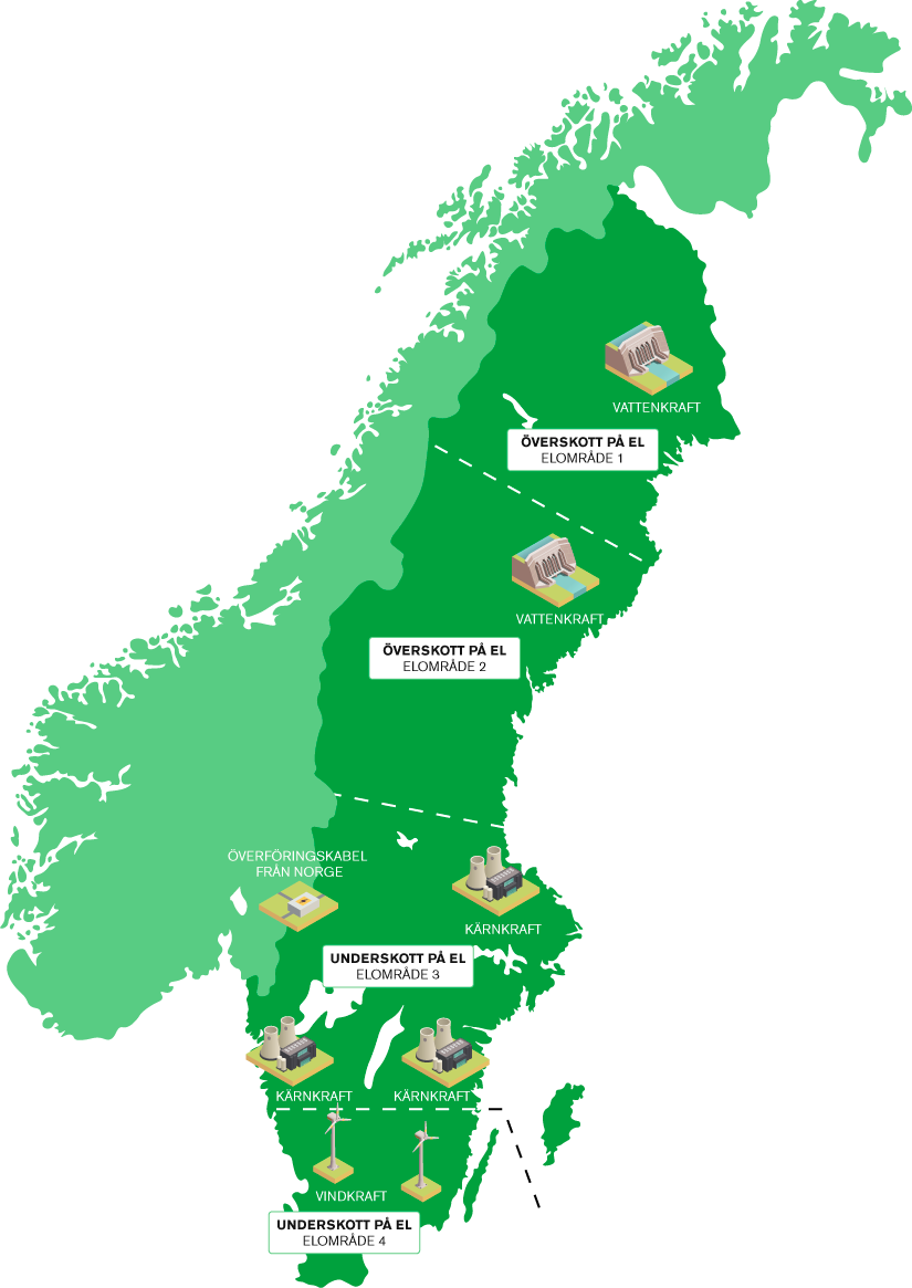 Karta som visar Sveriges elområdenEnligt vår chefsanalytiker Arne Bergvik finns förklaringen till den enorma prisklyftan främst att finna i fyra olika orsaker:
