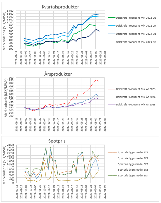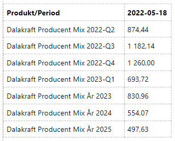 Priserna ovan är indikativa marknadspriser från Nasdaq för att binda i systempris i kronor/MWh i vår avtalsform Dalakraft Producent Mix. 100 kr/MWh=10 öre/kWh. Kontakta oss gärna för aktuella priser för att prissäkra inklusive/exklusive ursprungsgarantier och elcertifikat.