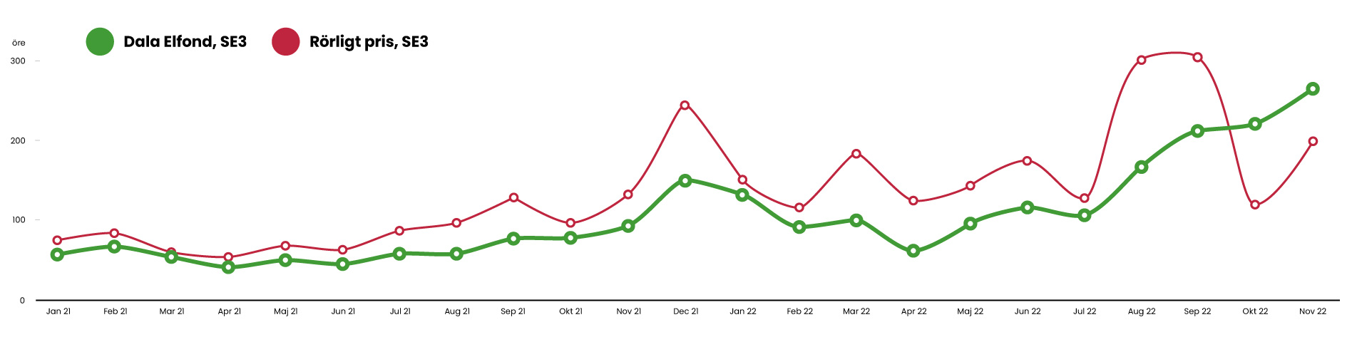 - Dala Elfond är ett förvaltat avtal där våra elhandelsexperter köper in elen efter marknadsläget och är framtaget för att vara ett stabilare och mer gynnsamt avtal över tid än till exempel ett vanligt rörligt spotpris som följer marknaden varje timme. Under hösten har vi upplevt en oförutsägbar marknad med prissvängningar på flera hundra procent från vecka till vecka. Det har gjort det svårt att bedöma när det är gynnsamt att handla el för framtida behov, förklarar Dalakrafts vd, Mats Bengtsson.