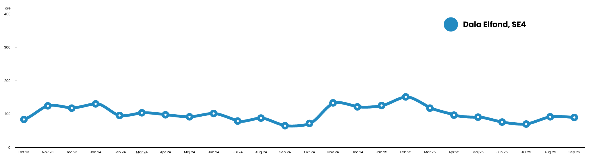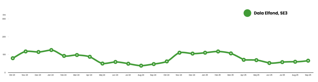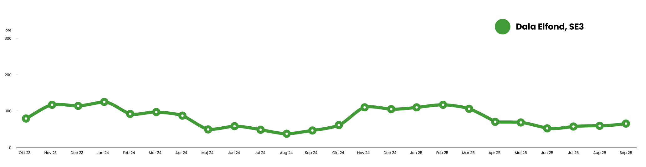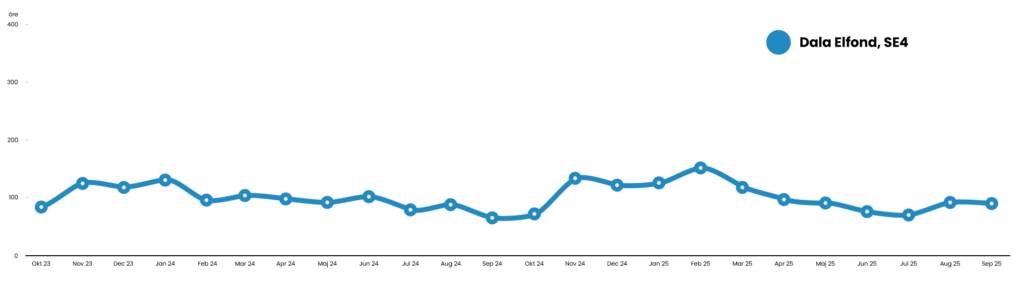 I september 2025 var snittpriset* på Dala Elfond för dig som är månadsdebiterad: